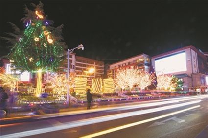 火樹銀花不夜天,流光溢彩呈繽紛?!敖衲甑囊咕罢嫫涟。 蓖钒⒁毯偷窃鍪迨逋盹埡髱е鴮O女來到將軍橋散步,在自己的家鄉(xiāng)欣賞到如此美妙的景色,登增叔叔忍不住夸贊。此時(shí),將軍橋道路兩旁的綠化帶在彩燈的映襯下輪廓畢現(xiàn),與玻璃棧道上的光影交相輝映,城市美景盡在其中。