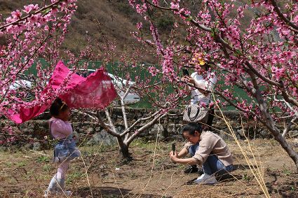 這個(gè)時(shí)節(jié),著名的賞花之地當(dāng)屬瀘定縣冷磧鎮(zhèn)杵坭的桃花谷。從瀘定縣城出發(fā),沿著大渡河右岸一路往下,行約20分鐘就能看到美麗的田野景色。只見,山頭上,田野間,或是房前屋后,統(tǒng)統(tǒng)換上了美麗誘人的春裝。放眼望去,李花、桃花、油菜花競(jìng)相綻放,爭(zhēng)奇斗艷。這里,桃花尤其繁盛,沿著山谷錯(cuò)落有致、次第盛開,讓人目不暇接,用一步一景來(lái)形容也一點(diǎn)不為過(guò)。