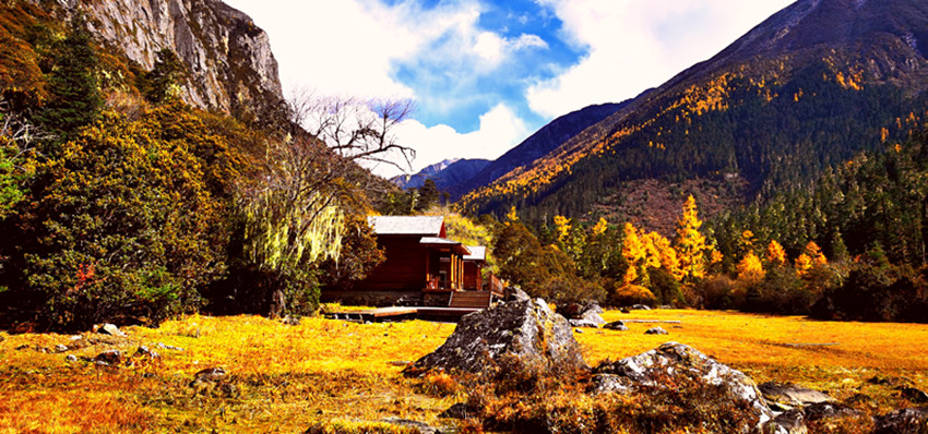 站在山谷放眼展望,金黃的草甸、蜿蜒透亮的小河、參天古木、悠閑啃草的牦牛,點綴其間的幾棟藏房,這一切構成一個幽靜而神奇的世界。步入其間,就像走進一個奇麗而孤寂的世外仙境以及純凈空氣的薈萃之地。置身其中,心曠神怡,仿佛自己是走在一幅渾然天成的美麗畫卷之中。