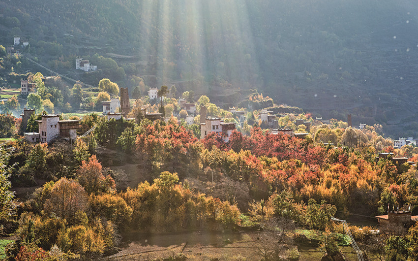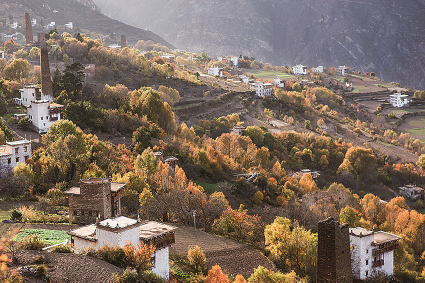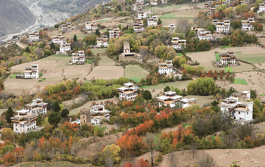 四季更迭,中路藏寨的魅力各異。秋天,正是藏寨最為絢爛的季節(jié)。造型獨(dú)特、別致的藏式民居,蜿蜒曲折的林間小道,組成了一幅美不勝收的畫卷。藏寨依山勢(shì)迤邐連綿,分布在相對(duì)高差近千米的山坡上,藏式樓房灑落在五彩斑斕的彩林中,與山谷、溪流、雪峰交相輝映,極富層次,構(gòu)成了一幅恬靜如詩(shī)的優(yōu)美畫卷。