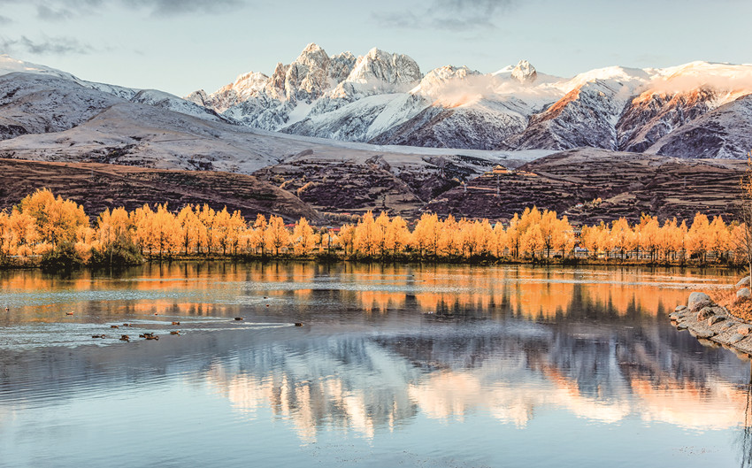 除了巍峨的雪山與彩林作伴,不少越冬的候鳥也飛抵珠牡湖。金色彩林倒映在清澈如鏡的湖面上,不時有候鳥游過,激起層層漣漪,為珠牡湖增添了不少生機與趣味。