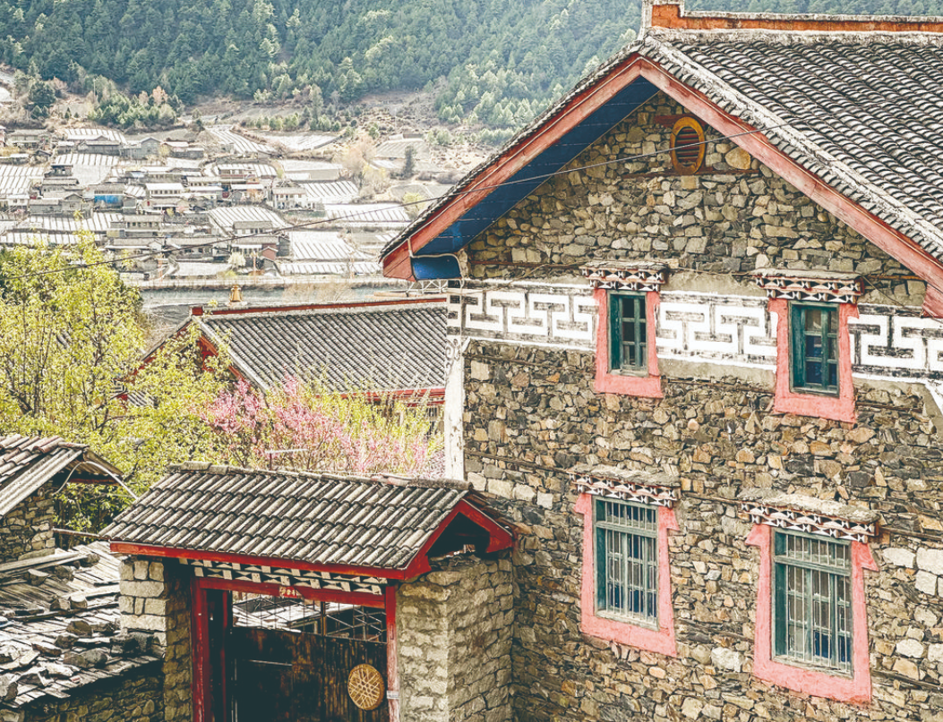 腳下的路在不停地延伸,一條或幾條通向了寨子深處,山桃花和果樹林那么茂密,只能望見藏房的瓦屋頂和彩繪木窗。
