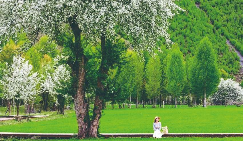 每年5月下旬,貢嘎海棠盛放的甲根壩就瞬間變身為秀美的世外莊園,木雅藏房錯(cuò)落有致,青稞麥田綠意蔥蘢,潔白的花朵成簇成團(tuán),溫暖漫山遍野,微風(fēng)輕拂,花落成雪,飄滿(mǎn)碧空如洗的天空,花兒灑在田間、落在地頭,在藍(lán)色的天空、棕色土壤和青綠色樹(shù)葉映襯下,顯得清新至極。