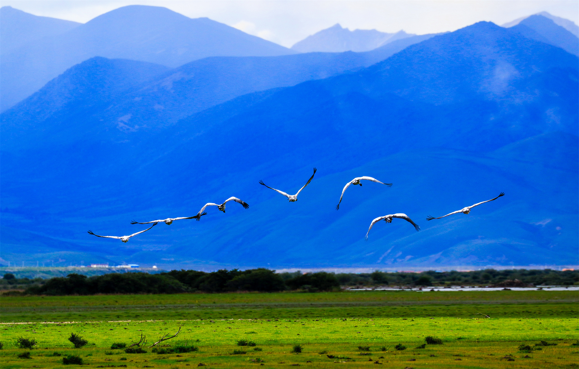 丹頂鶴、水獺、羚羊、青羊、黃鴨、旱獺等野生動物混雜其中;清晨,牧民的炊煙裊裊直上與草地上升起的淡淡薄霧混在一起,尤如幻境。