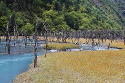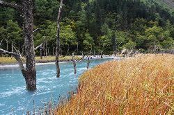 這里森林茂密,河流縱橫,生態(tài)原始,很多古樹(shù)浸泡在河水、沼澤之中,姿態(tài)怪異,神秘莫測(cè),猶如置身侏羅紀(jì)時(shí)代。傳說(shuō)這里是東巴神話《創(chuàng)世紀(jì)》的發(fā)祥地。