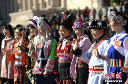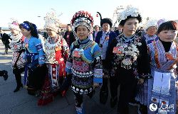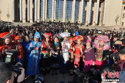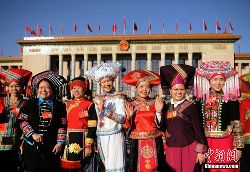 3月5日,第十二屆全國人民代表大會第二次會議在北京人民大會堂開幕。云南少數(shù)民族代表在進入會場前合影留念。中新社發(fā) 駱云飛 攝