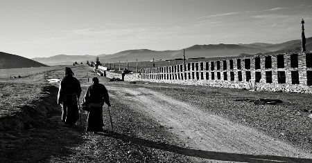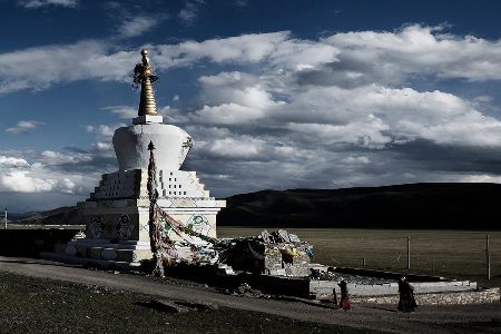 走近了,你會(huì)看見砌墻的石片上刻著密密麻麻的經(jīng)文;綿延的墻體上嵌著一個(gè)個(gè)窗口式的佛龕;每隔一段距離,石墻圍出一個(gè)回環(huán)的空間,類似于城墻上的烽火臺(tái);長(zhǎng)墻的兩端立著高大的佛塔,中段的108座佛塔排成長(zhǎng)長(zhǎng)的隊(duì)伍,和長(zhǎng)墻并行。