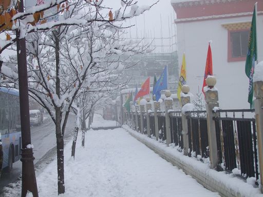 康定秋意正濃,河岸的楊柳還未泛黃,卻意外地迎來了一場不期而遇的降雪,也是今冬康定迎來的第一場雪。大片的雪花輕盈落下,康定城和跑馬山一片銀裝素裹,分外妖嬈。13日早上,康定城依然下著鵝毛大雪。這場深足30厘米的雪,使入冬以來一直持續(xù)的干燥空氣變得濕潤,雪景美不勝收,但也給人們出行帶來許多不便。記者在街道上看到車流量和行人明顯減少,機動車都放慢了速度,以確保行車安全。上學的學生,上班的人群都都裹上了厚厚的冬裝,小心翼翼地行走在雪地上。交警依然堅守在紛飛的風雪中指揮交通;環(huán)衛(wèi)工人和一些單位職工迎著大雪清掃馬路和庭院積雪。記者提醒司機,雨雪天氣謹防交通事故,行人要注意因雨雪路面濕滑,謹防摔傷。