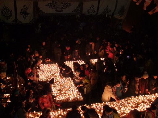 康定的幾座黃教寺廟舉行了法會(huì),擺酥油花,燃元根燈供佛。信教群眾除在家供燈外,有的還登跑馬山,赴南無寺敬燈油。入夜后又成群結(jié)隊(duì)涌向康定城中的安覺寺,參加元根燈會(huì),以此紀(jì)念藏傳佛教格魯派創(chuàng)始人、宗喀巴大師圓寂成佛。安覺寺里人潮涌動(dòng),熱鬧非凡。有扶老攜幼的信教群眾,有祈求平安的生意人,也有慕名而來的外地?cái)z影師。燈會(huì)這天,最忙碌的除了寺廟里的喇嘛,就數(shù)在寺廟周圍站崗的消防員了,消防員李剛說:“一大早就有遠(yuǎn)道而來的信教群眾和僧尼到寺廟里點(diǎn)燈了,為了保障寺廟的消防安全,我們已經(jīng)在這飄著雪花的冬日里站了整整一天了,要等到每一盞燈都安全的燃盡,我們才可收隊(duì)離開。”