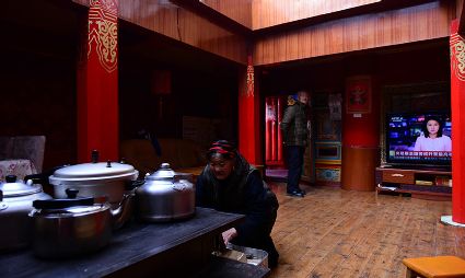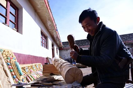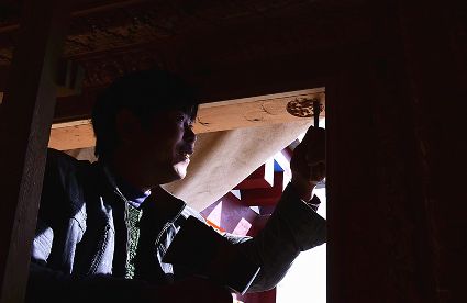 道孚民居的精華在其內(nèi)部,木材是其唯一的內(nèi)部裝飾材料,而裝飾,是一項(xiàng)繁瑣得曠日持久的藝術(shù)勞作,往往建房只需一兩個(gè)月,內(nèi)部裝飾則要幾年甚至幾十年。民間建筑藝術(shù)家們沉醉在細(xì)致入微的勞作里,讓每一個(gè)圖案都盈溢一份心底的吉祥,讓每一筆描摹都傳遞一份動(dòng)人的傳說(shuō)。房間四壁、房門和梁柱上一般都繪滿了精致典型的藏式壁畫(huà),窗上分別雕刻著龍、鳳、仙鶴、麒麟等吉祥圖案。每間屋的大門上都鑲嵌醒目的兩個(gè)獅頭大銅環(huán),凸顯了與之相融的漢文化的特點(diǎn)。置身其間,色彩斑斕中,身邊盡是龍飛鳳舞,鶴翔麟躍。繽紛中細(xì)端詳,真是藏民族藝術(shù)的天堂!