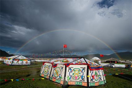7月31日,石渠縣扎溪卡大草原上,藍天、白云與草地、帳篷相互映襯。