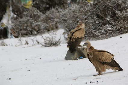 而隨后途經(jīng)中扎科鄉(xiāng),一群禿鷲正在飽食一頭死牛。牛身體內(nèi)流出的鮮血,早已和冰雪中板結的土層融合在一起。這些來自天空的使者用自己嘴和腸胃在一頭死去的牛和天空之間交接著某種儀式,它們的背景是雪,是具備凈化色彩的凝結物。這些禿鷲,它們自身也在從事著凈化的工作。