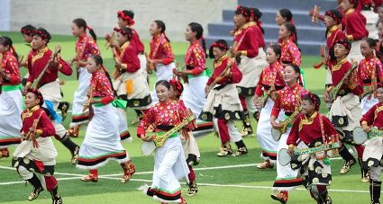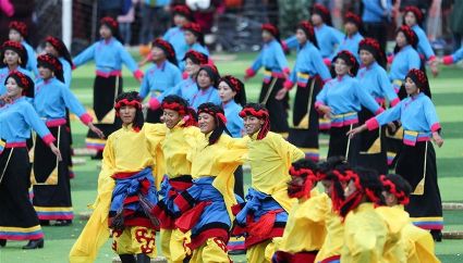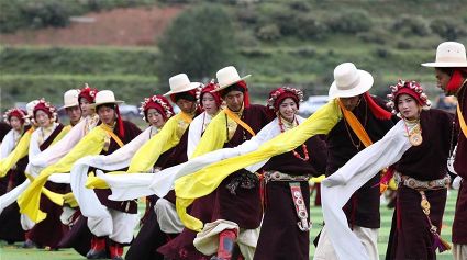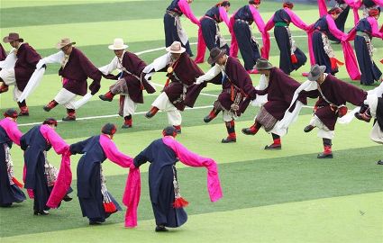 7月29日,來自四川省道孚縣各地的上萬名藏族群眾在道孚中學載歌載舞,歡慶第三屆安巴農(nóng)耕文化旅游節(jié)。安巴在藏語中是五月的意思,藏歷五月正值農(nóng)閑時期,藏族群眾都會舉行各種活動,祈禱風調(diào)雨順,吉祥平安。