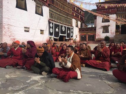 當(dāng)宣講組一行來(lái)到郭沙寺時(shí),寺廟僧人們?cè)缫哑炔患按牡群蛟谒聫R外?!奥?tīng)說(shuō)你們今天要來(lái),我們?nèi)律舷露己芨吲d、很期待?!彼聫R堪布甲它激動(dòng)地說(shuō)。