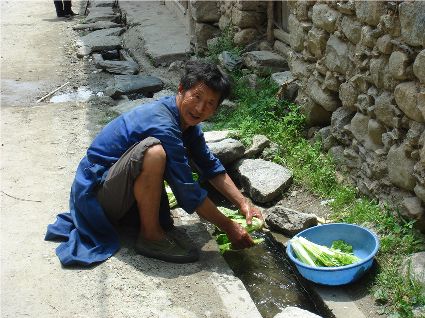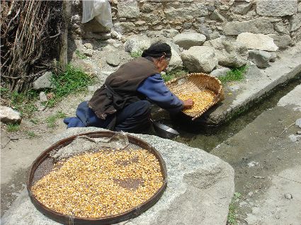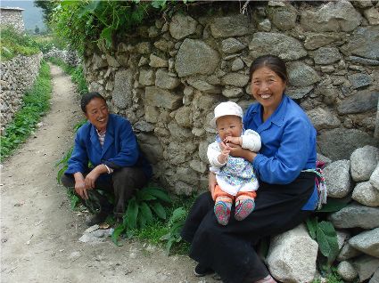 那天清晨,我們一行就乘坐曉雨哥所開轎車從康定城出發(fā)了。從顯得很懸的山路上到位于山頂平壩的嵐安古鎮(zhèn)時(shí),才8點(diǎn)過(guò)一點(diǎn)。朝鎮(zhèn)里走去,先后見到了從地里背洋芋回家的小孩、從地里收了豆菽枯藤的中年人等。