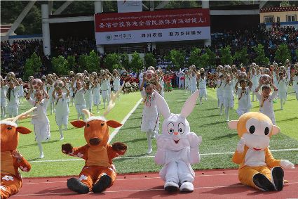 “本屆少數(shù)民族傳統(tǒng)體育運動會的會徽以格薩爾王賽馬登位為基本形象,由字母‘SC’組成的騎手代表‘四川’,數(shù)字‘15’組成了昂揚奔騰的‘馬’為主體的形象,代表‘15屆民運會’。這既有藏民族特色,又顯得美觀大方?!痹陂_幕式現(xiàn)場,來自杭州的陳琳興致勃勃地說。