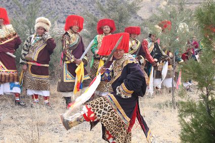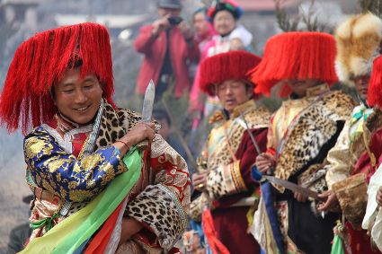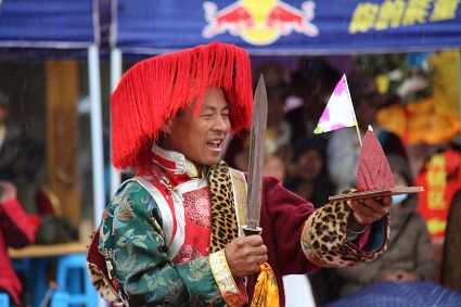 除了歌舞文化,德欽還是民俗文化最大的平臺(tái),神山祭祀是村村寨寨必不可少的活動(dòng),在德欽,藏民對(duì)山水自然賦予了靈性,認(rèn)為自然也是和人一樣有著生命和靈性,尊重自然演繹出神山祭祀活動(dòng)豐富多彩。“刀贊” 藏語(yǔ)稱“百諧”。在德欽農(nóng)村,刀贊是祭祀活動(dòng)的重頭戲,這一天,不亞于一個(gè)盛大的服飾表演。相傳“百諧”是古時(shí)村民為消除戰(zhàn)亂,祈福平安的一項(xiàng)傳統(tǒng)祭祀活動(dòng),延續(xù)至今已經(jīng)成為一項(xiàng)傳統(tǒng)的民俗活動(dòng)?!鞍僦C”既是祭祀活動(dòng)的一個(gè)儀式,也是一個(gè)獨(dú)立的傳統(tǒng)民俗活動(dòng),村里每戶一男丁在這一天必須參加“百諧”。“蘇夏”是村里男人戴的最為隆重的帽子,他不同于金邊帽和狐皮帽。長(zhǎng)刀是“刀贊”的道具, “吉祥的日子里,我們一敬天地,賜給我們帶來(lái)幸福的生活;再敬尊敬的共產(chǎn)黨,為我們帶來(lái)平安吉祥;三敬慈祥的雙親,教會(huì)我們?nèi)绾巫鲆粋€(gè)好人……”朗朗上口的說(shuō)詞伴著閃閃的刀光起舞,頗具康巴壯士的英武陽(yáng)剛。