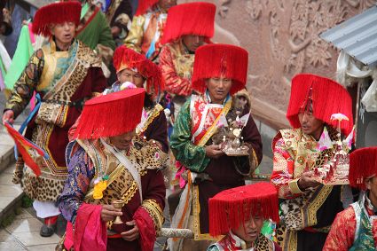 射箭也是德欽以及周邊些村落的重要民俗活動(dòng)之一,村里的男人們盛裝出場(chǎng),在射箭場(chǎng)彎弓搭箭,從7、8歲小孩到50多歲的老人都要參加射箭,甭管你射得中靶子與否,笑聲里充滿了和諧和喜慶。德欽縣的江坡村,在每年桃花盛開(kāi)的季節(jié),都要開(kāi)展盛大的射箭節(jié),全縣的射箭愛(ài)好者都前來(lái)一顯身手,康巴漢子們不僅射得一手好箭,還得會(huì)拉弦子,悠揚(yáng)的弦子聲可以給射手們加不少分,活動(dòng)的初衷就是要求藏族男人必須能文能武。弦子聲聲,唱出了藏家百姓美好的生活,村里的女人戴上了各種金銀首飾,男人們手拉弦子,盡情歡暢的唱著、跳著,村里的老人們是忠實(shí)的觀眾,看著大家在舞場(chǎng)里的步子,他們也跟著笑得合不攏嘴,有些年輕人還不時(shí)跑出舞場(chǎng)到場(chǎng)邊的老人們面前請(qǐng)教弦子的唱詞,老人們總是不厭其煩的傾囊相授,因?yàn)樗麄冊(cè)?jīng)也是弦子舞場(chǎng)的“明星”。