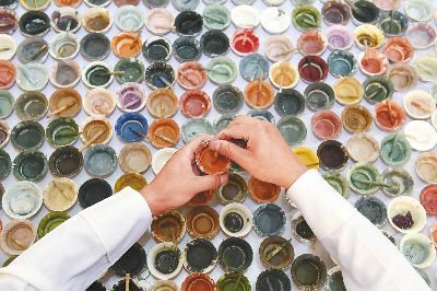 傳統(tǒng)的唐卡是藏族文化中一種獨具特色的繪畫藝術(shù)形式,需經(jīng)繃布、打磨、定位、起稿、涂色、暈染、拉線條、拉金線等多種程序,天然原料作色保證了畫作幾百年后色澤還依然鮮艷。在著著的畫室里,擺放了百個裝滿各色礦物質(zhì)顏料的調(diào)色小碗,“上色用的是延續(xù)千年的礦物研磨顏料?!睘榱俗岊伭献魃鶆颍€用自己的辦法搞出了專用的顏料攪拌機。