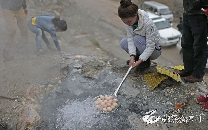 這里的溫泉很有趣,在石頭里能傳來(lái)水燒開(kāi)后的聲響,而在露天的溫泉眼,水花噴涌,溫泉的溫度很高,據(jù)說(shuō)有90度,我們拿了好多雞蛋,用漏勺盛著,放進(jìn)去煮,幾分鐘后,就熟了。蛋黃完全凝固了,可見(jiàn)溫度是很高的。