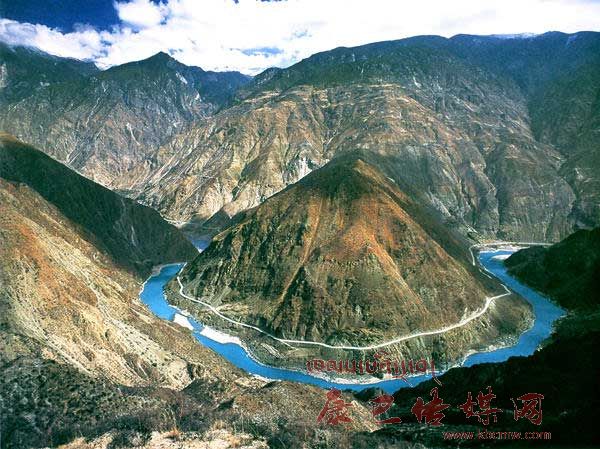 金沙江第一彎以“雄、奇、險(xiǎn)、峻著稱,位于距得榮縣城60公里處的甲學(xué)村和木擁村之間。由北向南縱貫全境的定曲河,在先后接納瑪伊河和碩曲河后,攜三河之水投入金沙江懷抱。匯水處形成了“三壁夾兩江”的奇景。穿越峽谷而來(lái)的金沙江由此水勢(shì)更加浩蕩,峽谷逐漸開(kāi)闊,在即將沖出川、滇要塞時(shí),由于高山的阻擋,拐了一個(gè)馬蹄形的大彎,流成了天下奇觀——中國(guó)四十大景觀之一的“金沙江第一彎”。從云南境內(nèi)的奔子欄,可以更完整地欣賞“金沙江第一彎”。