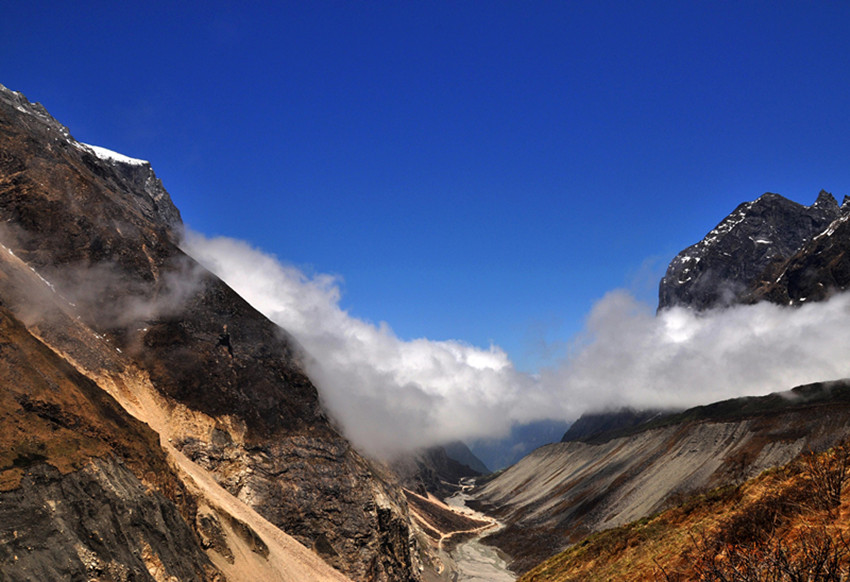 第二天,我們準(zhǔn)備游玩燕子溝,醒來(lái)的第一件事就是拉開(kāi)窗簾看看天氣,又一陣興奮,天氣依然非常晴朗,今天是進(jìn)燕子溝的第一天,我早做足了準(zhǔn)備,太陽(yáng)帽、墨鏡、食品等等一樣不少。從磨西到燕子溝溝口的路程很長(zhǎng),需要坐景區(qū)的觀光車,因?yàn)樘鞖獾脑颍缴现挥猩傩┰旗F繚繞,環(huán)在山腰,仿佛是一幅山水畫景。我們先來(lái)到了冰窖口,這里的海拔有三千多米,所幸大家都沒(méi)有高原反應(yīng),后坐車下山,來(lái)到有“定海神針”之稱的一棵高大筆直的杉樹。這棵杉樹皮粗厚,已經(jīng)沒(méi)有了樹葉,樹枝也寥寥無(wú)幾,更顯滄桑。站在樹下遙望,顯得人是那么渺小。不禁讓人遐想這顆千年古樹的滄桑歷史。然后開(kāi)始步行游玩,這里海拔比較低,走 起來(lái)不是很累,在城市中見(jiàn)慣了高樓大廈,車水馬龍的我們,此刻真有一種離開(kāi)凡塵,來(lái)到世外桃源的感覺(jué),我們一路依山而上,越走越高。我們終于來(lái)到了天藥水坪,這里的景色已經(jīng)完全不同于山下,看著遠(yuǎn)處的山,我們都不約而同地“哇”了一聲。