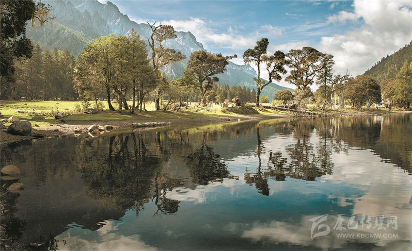 “江”與“湖”,靜臥于原始森林與草甸花海的之間,河溪清澈,湖水湛藍(lán),真如秘密花園,人間仙境。湖畔最美的是盤根錯(cuò)節(jié)的老柏樹(shù),枝條彎曲如蒼龍,或立于湖畔,或臥于湖中,滿湖樹(shù)影、花影隨風(fēng)搖曳。