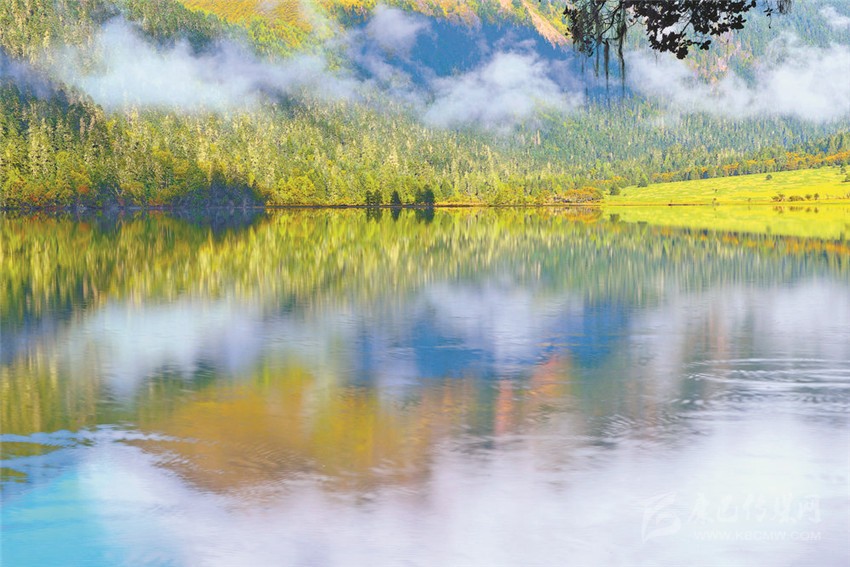置身于雪山、湖色與草色,陽(yáng)光精確地照在一棵金色的樹(shù)上,樹(shù)的光亮奪目與遠(yuǎn)處云霧繚繞的暗山形成反差,如夢(mèng)如醉。