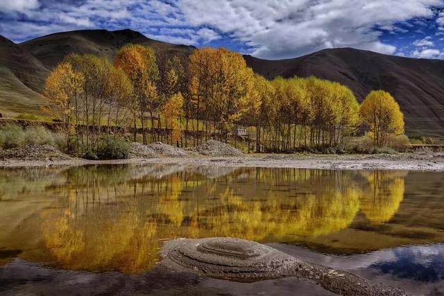 漫山遍野的紅樺林承包了黨嶺的秋日色彩,4000多米的葫蘆海被山谷自然包圍,圓形的平靜湖面如明鏡,倒映著天空與山林,美得一塵不染。