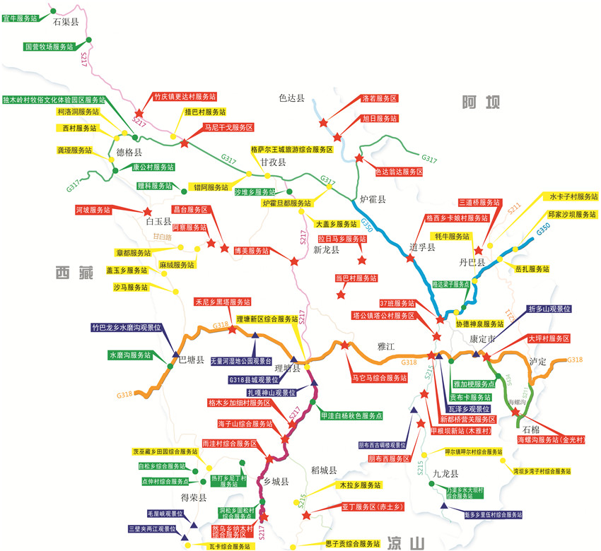 77個服務(wù)區(qū)(站、點(diǎn))地處我州六條旅游線路和十條景觀大道。主要集中在:G318線(瀘定——康定——雅江——理塘——巴塘),G350線(丹巴——八美——道孚——爐霍——色達(dá)),S217線(理塘——稻城——香格里拉鎮(zhèn)——亞?。?,S211線、S434線(瀘定——海螺溝——榆林)。