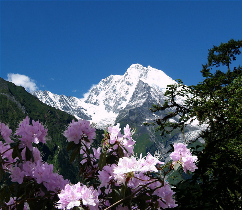從海螺溝翻越雅家埂到康定的道路兩旁有很多品種的杜鵑花,埡口海拔1000米下生長的杜鵑花樹高大,以緋紅色、粉紅色、紫色為主。海拔越高,花樹越矮,從山頂?shù)缴窖恢变佒氖前咨幕ǘ洌袷墙豢椩谏揭暗陌谆ǖ靥骸?/p>