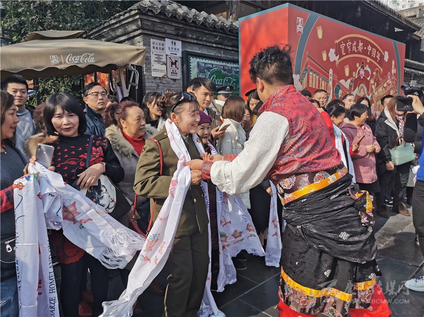 快閃還未開始,20名身著少數(shù)民族服裝的藏族姑娘小伙,便成為了一道最獨特、亮麗的風(fēng)景線。隨后,他們給游客們帶來了獨具甘孜特色的歌舞《康定情歌》《甘孜踢踏》,悠揚(yáng)的歌聲、奔放的舞步,讓圣潔甘孜大美天成的獨特風(fēng)韻完美展顯,吸引了春熙路如潮的人群,被歌舞魅力感染,不少市民隨著他們一起唱跳了起來。而此時的成都寬窄巷子里,也正在演繹著一場震撼的“快閃”,四名穿著格薩爾王服飾的大將,身披鎧甲、手持刀劍,格外威武帥氣,市民和游客紛紛拿出手機(jī)拍照留念?!翱扉W”結(jié)束后,熱情的甘孜兒女為周邊的觀眾獻(xiàn)上潔白的哈達(dá),向他們致以美好的祝福,并誠摯歡迎他們到甘孜旅游。