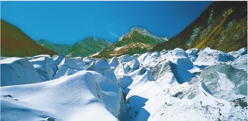 海螺溝位于貢嘎雪峰腳下,以低海拔現(xiàn)代冰川著稱于世。晶瑩的現(xiàn)代冰川從高峻的山谷鋪瀉而下;巨大的冰洞、險峻的冰橋,使人如入神話中的水晶宮。