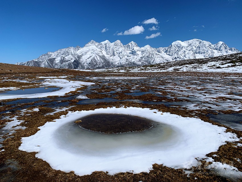 迷魂凼可以看見貢嘎衛(wèi)峰五色山系及貢嘎主峰周邊的愛德嘉峰、嘉子峰、日烏且峰和小貢嘎。在季節(jié)性小湖邊,湖面倒影著雪山,仿佛一幅絕美的風光畫,走進其中,便成了畫中的一部分。