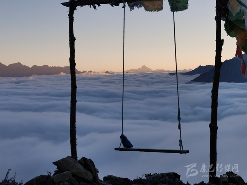清晨,坐在網(wǎng)紅多吉的秋千上,蕩著秋千看霞光里的云起云涌,美,不可言說。