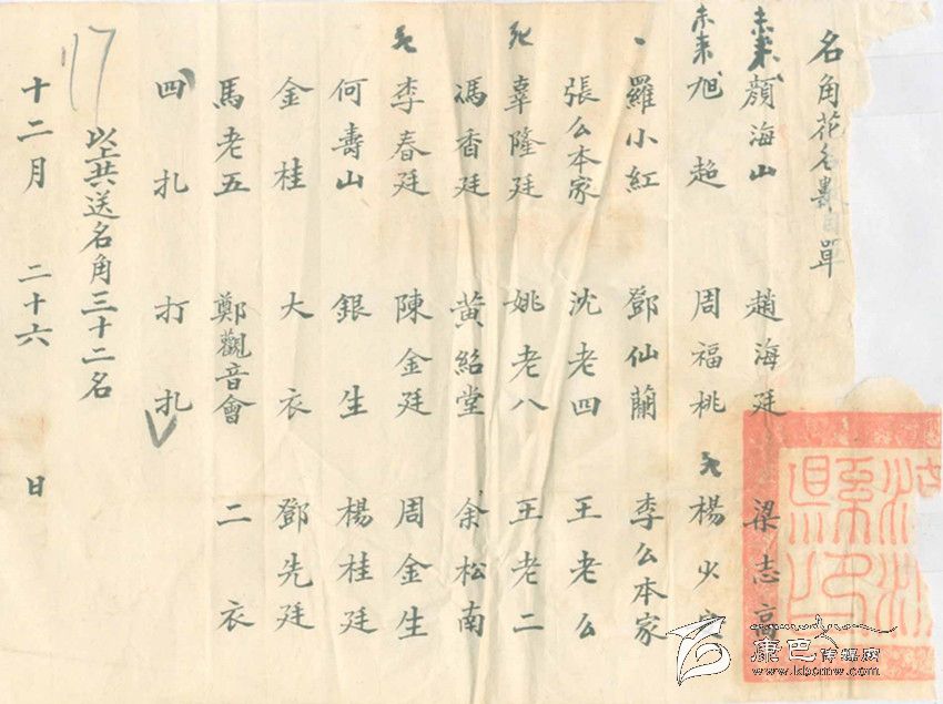 不準(zhǔn)賭博做什么呢?當(dāng)時(shí)的當(dāng)權(quán)者還是費(fèi)了一番心思,他們從外地請(qǐng)來(lái)了一個(gè)川戲班子,為了吸引人們關(guān)注,康定縣政府把戲班的名角以及配角演員名單寫(xiě)成海報(bào)張貼到街頭,又抄成傳單廣為散發(fā),用現(xiàn)在的話(huà)說(shuō)是,做足了戲班出場(chǎng)前的前期宣傳工作。從名單上看,這是一個(gè)不小的戲班子,所謂名角竟有32名之多。想來(lái)對(duì)于沒(méi)有多少文化生活的康定民眾,還是有一定的吸引力。