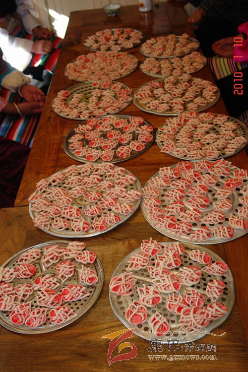 “花茹”是一種用面粉制作的糕點(diǎn),是巴塘人逢年過(guò)節(jié)、婚禮慶典等節(jié)慶日不可或缺的美食佳肴,可以這樣說(shuō),在節(jié)日期間或宴請(qǐng)賓朋之日,在眾多的糖果糕點(diǎn)中,如缺少了“花茹”,便自然就失去了巴塘風(fēng)味。