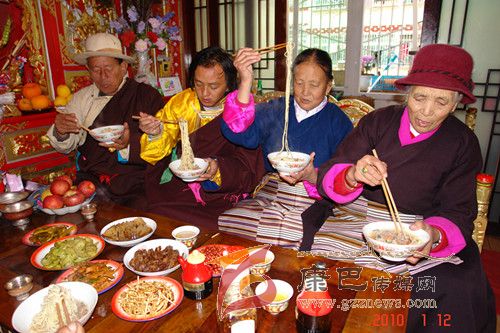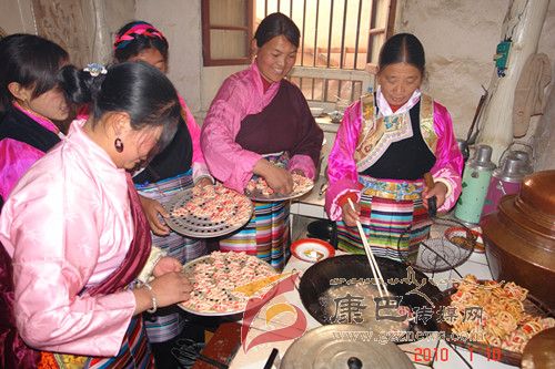 巴塘人一年當(dāng)中有很多重要的節(jié)日,而最重要的莫過(guò)于過(guò)春節(jié)。隨著農(nóng)歷新年的來(lái)臨,巴塘人過(guò)春節(jié)的氛圍也越來(lái)越濃烈了。掃塵、貼春聯(lián)、殺年豬、罐血腸、樹(shù)經(jīng)幡、獻(xiàn)“切瑪” 、曬牛肉干、做長(zhǎng)面、炸“花茹” 、 釀青稞酒等等,人們臉上綻放出春天的笑顏,喜逐顏開(kāi)迎候新春佳節(jié)的到來(lái)。而在眾多的風(fēng)味飲食中,炸“花茹” 、 吃長(zhǎng)面(當(dāng)?shù)厝朔Q(chēng)之為“金絲面”)是巴塘人春節(jié)時(shí)家筵中必不可缺的美食佳肴。