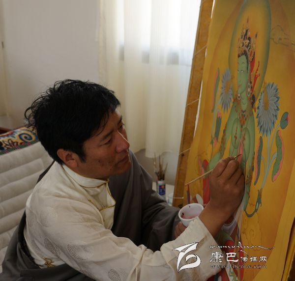 “如此工藝精細、筆法工整的繪制過程,必然注定價值的與眾不同。”記者話音未落,他便迫不及待地加以了例證:“比如,要繪制一幅長1.25米、寬1米的‘多派唐卡’,需要有近百個佛像,最小的佛像頭部只有指甲蓋大小,筆觸要求非常細膩,哪怕每天都堅持畫十幾個小時,至少也要一年多時間來才能完成。由于題材從宗教轉向世俗、審美從傳統(tǒng)走向現(xiàn)代、技法從圖像制作走向藝術創(chuàng)造,唐卡作為‘藏密文化’的概念正逐漸被世人所知,并成為唐卡藝術品市場上的寵兒。2012年3月18日,我和一級唐卡畫師丁嘎創(chuàng)作的《五度母像》長幅唐卡以168萬元的高價被收藏者購買,創(chuàng)下了‘多派唐卡’最高售價紀錄,‘多派唐卡’也因此成了公眾與輿論關注的熱點和焦點。”