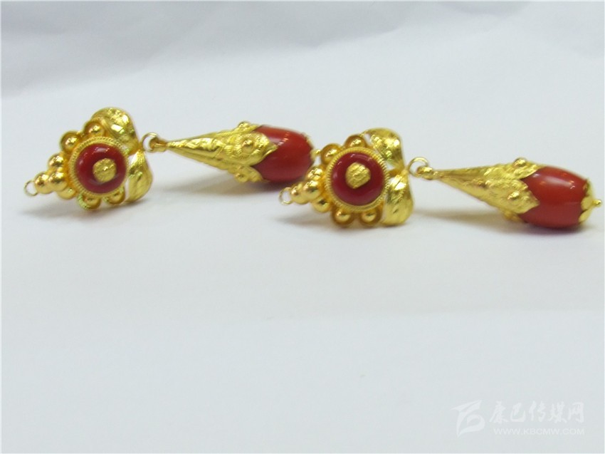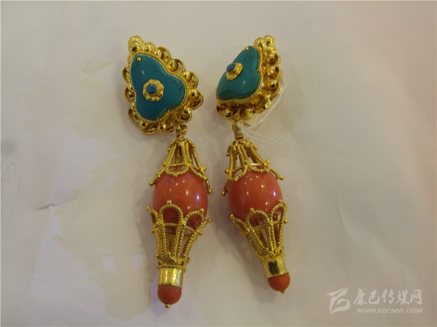經典的紅綠配耳環(huán)。撞色一直都是永不落伍的時尚,紅綠搭配的巧合,是藏民族熱愛生命與熱情好客的象征,用流光溢彩的金色將紅與藍包圍并連接,看起來協(xié)調而美好,搭配起來更為時尚。據(jù)店家介紹,此款耳環(huán)凈重22.75克,加上手工費,售價7000余元。