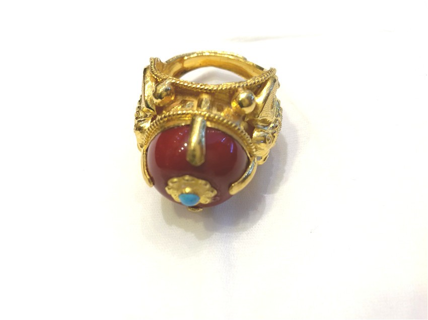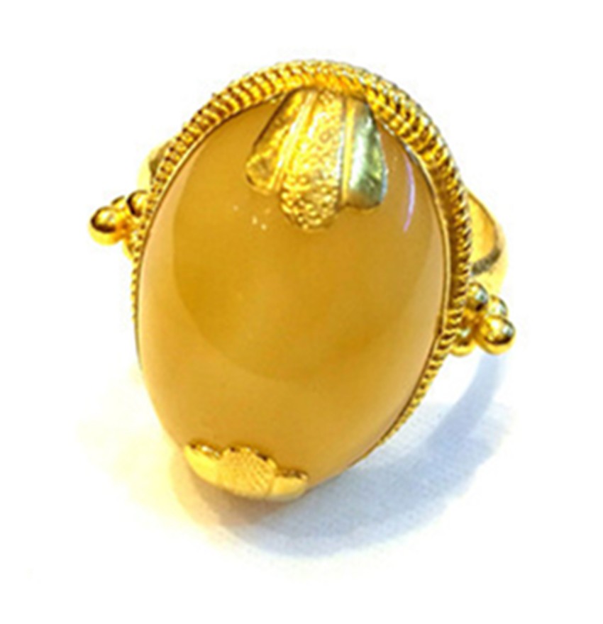 蜜蠟是藏家裝飾中的上成品,藏民族對蜜蠟的喜愛是非常誠懇的,表達著他們對大自然的無限崇敬之情與大自然饋贈的感謝之情。在他們看來,蜜蠟除了能夠作裝飾品佩戴、收藏之外,最引人注目的就是靈性修行之功效,設計師在此款戒指的設計上,緊扣藏民對蜜蠟的喜愛,并將漢式花邊與蜜蠟結合,是對藏漢文化交流較好的體現(xiàn)。