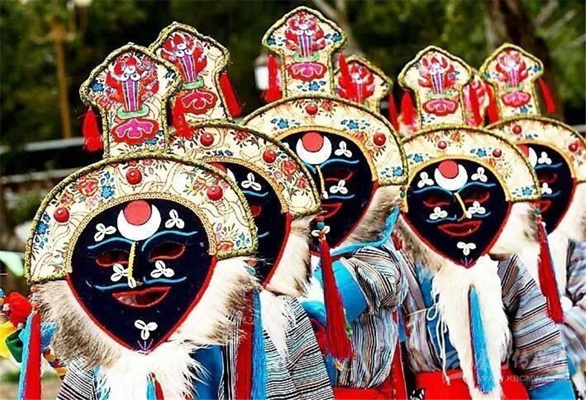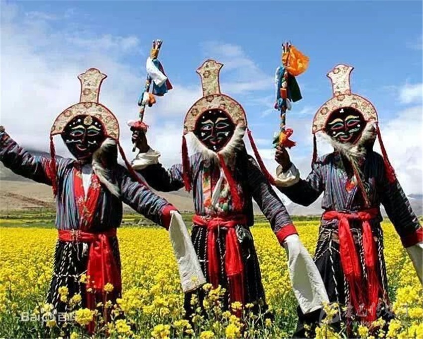 第三部分,被稱為“扎西學”。頭戴白羊皮面具,面部呈黃色的演員們是吉祥老人的化身。他們雖然老態(tài)龍鐘,但動作卻輕盈無比。其裝束除了腰間纏繞的“子體”未掛五色彩綢外,與“溫巴”別無二致。他們在歡樂的舞動,向眾人賜福吉祥。