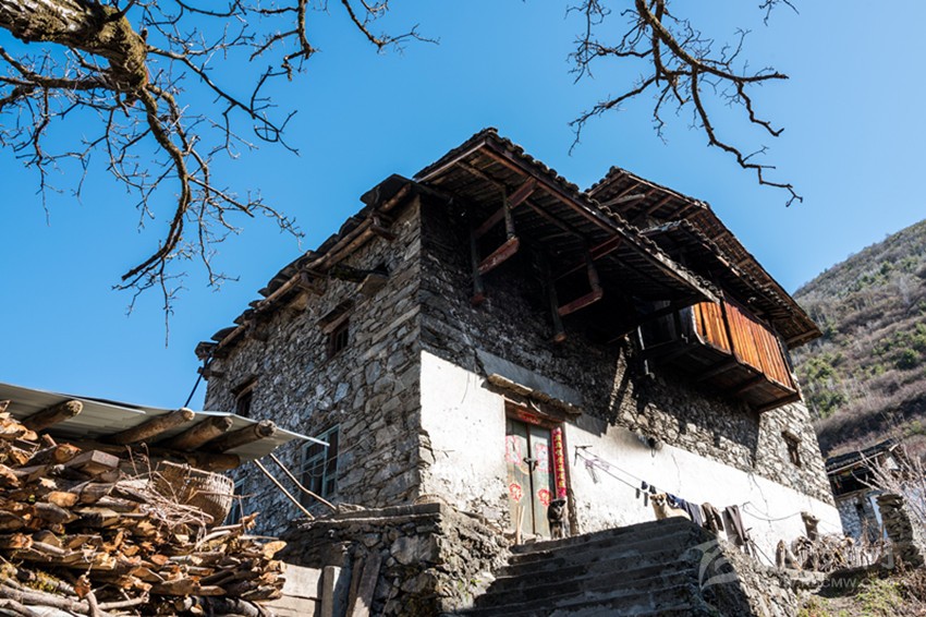魚通人的房屋符合古人對居所背山面水的要求,多依山而建。房屋為木石混合結(jié)構(gòu),以片石木材和黃泥為主要材料建成,當(dāng)?shù)厝朔Q之為“碉房”。房屋用石塊壘起,以木頭為墻筋,每隔一定高度,橫砌進(jìn)入石塊,融為一體,使之更為堅(jiān)固牢靠?!暗锓俊?/span> 一般為三層或四層,呈四角或六角形。底層為關(guān)牲畜。第二層為“堂屋”, 在過去,是集做飯、吃飯、烤火、家人日?;顒訛橐惑w的場所,地上設(shè)有火塘、灶,并在火塘上設(shè)石制三腳鍋莊或鐵三腳。第三層為各居室,有的設(shè)有貯藏室和會客屋。頂層為經(jīng)堂,室外為曬壩,作打場、曬場用。有些在外側(cè)設(shè)有一小吊腳樓,可堆放雜物。隨著時間的流逝,古老的碉房已無法滿足現(xiàn)在居民的需求,已很少有人居住,而新式碉房在傳統(tǒng)的基礎(chǔ)上開始出現(xiàn)。