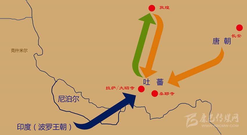 吐蕃贊普朗達(dá)瑪遇刺,藏傳佛教在吐蕃復(fù)興,歷史學(xué)家稱之為“后弘期”。后弘期有“上路弘法”和“下路弘法”兩次佛教傳入西藏的運動。在“上路弘法”的過程中,犍陀羅藝術(shù)被帶到了拉達(dá)克、古格,也帶進(jìn)了衛(wèi)藏地區(qū)。而“下路弘法”則把漢地的繪畫風(fēng)格再次帶到了衛(wèi)藏地區(qū)的扎塘寺等地。