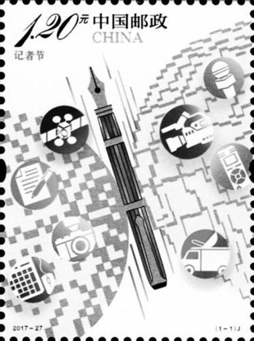 為紀(jì)念第18個記者節(jié)。中國郵政定于2017年11月8日發(fā)行《記者節(jié)》紀(jì)念郵票一套1枚。郵票圖案采用了具有現(xiàn)代感的構(gòu)成手法及色彩表達(dá)方式。畫面中的鋼筆象征了記者秉持弘揚(yáng)民族精神、維護(hù)國家利益和社會責(zé)任的專業(yè)精神和自信風(fēng)范。兩側(cè)的線條及方點(diǎn)構(gòu)成的兩個圓形圖案分別隱喻地球和現(xiàn)代網(wǎng)絡(luò)體系,表示在新媒體時(shí)代,新聞傳播媒介所呈現(xiàn)出的多元化、全球化的發(fā)展態(tài)勢。畫面中麥克風(fēng)、攝像機(jī)、錄音筆等形式各異的采編設(shè)備圖標(biāo),結(jié)合衛(wèi)星及地面發(fā)射站等元素,突出了當(dāng)代記者巨大的社會影響力。同時(shí),鋼筆和兩側(cè)的圓形圖案共同組成了一只振翅飛翔的蝴蝶形象,喻意了記者追求至善至美,在探訪報(bào)道中擔(dān)負(fù)著傳播先進(jìn)文化,引領(lǐng)和維護(hù)和諧社會,推動人類文明的崇高使命和社會責(zé)任。