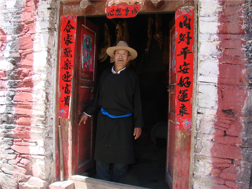 孫文權(quán)大叔告訴我,他常將別人唱的好歌詞記下來,經(jīng)常找別人對山歌,無論是行走在山道上,還是在田地里干活都能唱。他和妻子毛大娘就是在一次對山歌時結(jié)下的緣分,因為妻子也喜歡唱“啦啦調(diào)”山歌,自然而然地就走到了一起。成家后,日子平淡無奇,然而唱山歌的熱情卻絲毫未減。有時兩位到地里勞作時,還要先唱上幾句山歌,才開始勞作。孫文權(quán)大叔雖然只讀到三年級,識字量卻不少,他告訴我,每當聽到別人唱得好的歌詞,他都會用筆記錄下來。對于寫不出來的字,先注上拼音,回到家里后,問幾個娃娃。“本來寫滿了兩本,沒想到去年在搬家時,不知道丟到哪里去了,太可惜了?!彼麚u著頭惋惜的說。當我問及為什么這么喜歡丹巴啦啦調(diào)山歌時,他告訴我,丹巴山歌的歌詞寓意深遠,其中大多來源于生活,所描繪的場景生活氣息非常濃郁。