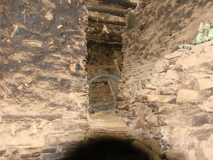 鍋莊房后,有兩道門,其中一間為放置糧食的庫房。而另一間房屋,門檻高于鍋莊房許多,需要跨上兩級臺階才能上去。門較矮小,打開房門,一股潮濕的氣味撲鼻而來,眼前一片漆黑,什么也看不見。我打開隨聲攜帶的電筒,借助微弱的光線,勉強(qiáng)能看見房屋內(nèi)的擺設(shè)。房屋的右面角落里,有用木頭搭建起來的籠子,其高約一百三十厘米,寬約一百厘米。在房屋的左邊,有一曲折的甬道,也需要走上兩級臺階。牟大哥告訴我,這里是用來關(guān)押犯人的地方。