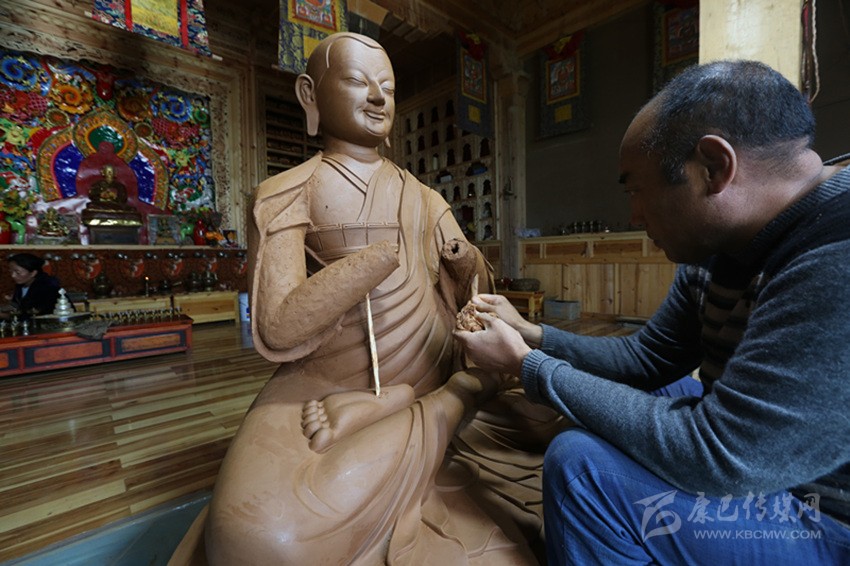 見到克村時,他正在鄰村一農(nóng)戶的經(jīng)堂里制作佛像,盤坐在蓮花寶座上的宗喀巴大師和兩個弟子身披袈裟手持經(jīng)書的泥塑作品神形兼?zhèn)?,這是克村和徒弟多登近半個月的心血??舜遄诓級|上,心無旁騖神情專注地,用木制工具對作品進行打磨,旁邊擺放著一盆清水和一筐自制的工具。