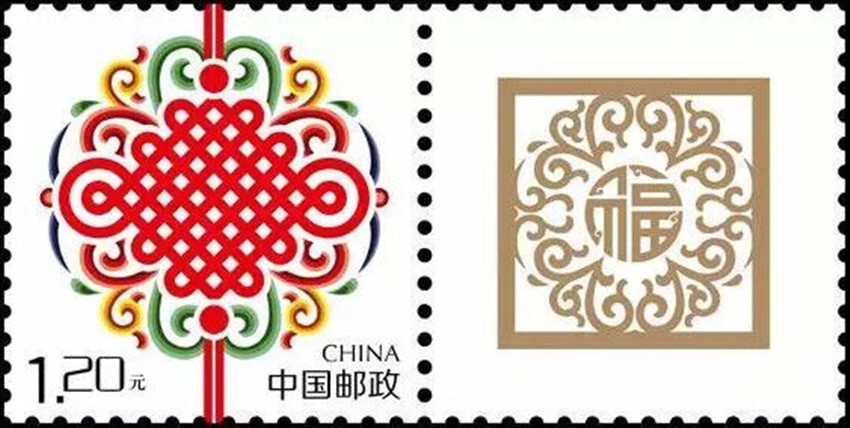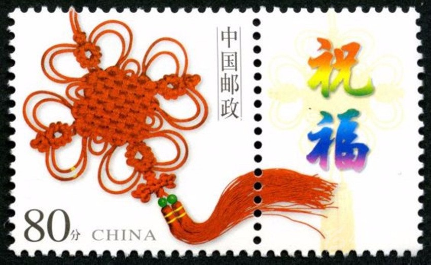 2002年5月10日,中國(guó)郵政發(fā)行《如意》個(gè)性化服務(wù)專(zhuān)用郵票一枚。主票圖案為如意柄端系著一個(gè)紅色“中國(guó)結(jié)”,附票有“祝?!倍?; 2003年3月3日,中國(guó)郵政發(fā)行《同心結(jié)》個(gè)性化服務(wù)專(zhuān)用郵票一枚。主票圖案為盤(pán)長(zhǎng)結(jié)4邊編織有心型繩結(jié)的同心結(jié),附票為“祝福”二字;2006年9月25日,中國(guó)郵政發(fā)行《中華全國(guó)歸國(guó)華僑聯(lián)合會(huì)成立五十周年》紀(jì)念郵票一枚。圖案為阿拉伯?dāng)?shù)字“5”與中華全國(guó)歸國(guó)華僑聯(lián)合會(huì)圓形會(huì)徽組成數(shù)字“50”,象征全國(guó)僑聯(lián)五十周年,背景畫(huà)面為淡淡的粉紅色“中國(guó)結(jié)”。寓意歸國(guó)華僑與全國(guó)人民血肉相連,同心同德共同建設(shè)美好家園;2013年8月8日,中國(guó)郵政發(fā)行一枚《美好祝?!焚R卡專(zhuān)用郵票,圖案為象征喜慶的紅色“中國(guó)結(jié)”;2014年9月20日,中國(guó)郵政發(fā)行《中國(guó)夢(mèng)(二)——民族振興》特種郵票,其中第四枚“民族團(tuán)結(jié)”,圖案中載歌載舞的各民族群眾上方有一個(gè)大紅的“中國(guó)結(jié)”,象征著各民族大團(tuán)結(jié)。