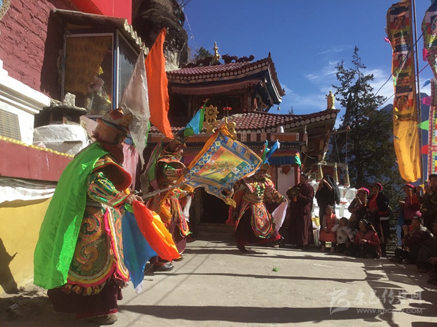 趁著等待的時(shí)間,我們來(lái)到寺院前的壩子里。寺院的壩子長(zhǎng)約十米,寬約兩米,非常的袖珍。在壩子的邊沿上,站滿了前來(lái)朝圣的人們。壩子里,法號(hào)陣陣、海螺聲聲,幾位頭戴面具、披著戰(zhàn)袍、手拿寶劍的喇嘛正在為人們演繹藏戲《格薩爾王》。在鼓點(diǎn)的指引下,他們或騰挪,或舞動(dòng),或跳躍,金戈鐵馬的戰(zhàn)爭(zhēng)場(chǎng)面躍然眼前。